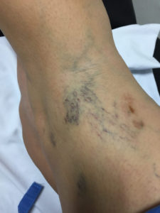 Las varices son causadas debido a un defecto en las válvulas de las venas, en esta fotografía se observan las famosas arañitas vasculares (telangiectasias y venas