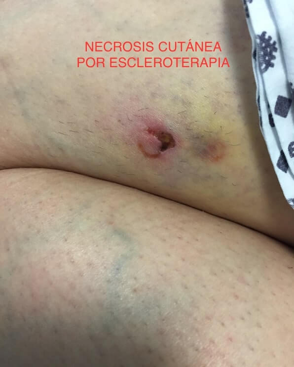La escleroterapia es el procedimiento mediante el cual se introduce un liquido que causa la destrucción del trayecto venoso y es el tratamiento de elección para la etapa clínica 1 (ver etapas de las varices); Y como todo procedimiento una de las complicaciones más temidas es la necrosis cutánea tal y como se muestra en la fotografía, de ahí la importancia de acudir con un Angiólogo y Cirujano Vascular.