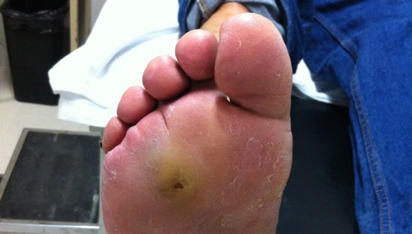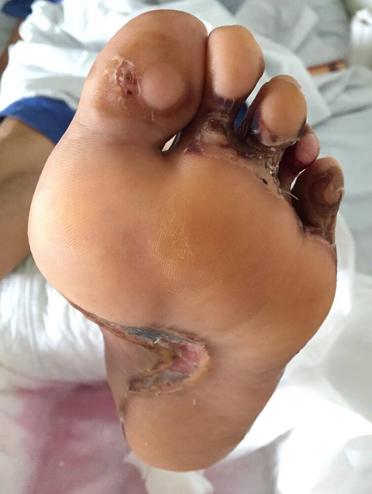 Paciente con quemadura por químicos el cual observa las lesiones al retirarse el calzado por perdida de la sensibilidad causado por la diabetes