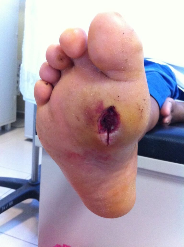 Paciente con lesión en la planta del pie de lado derecho por pisar un clavo en su trabajo del cual no se percato hasta llegar a su domicilio al retirarse el calzado por la perdida de la sensibilidad.